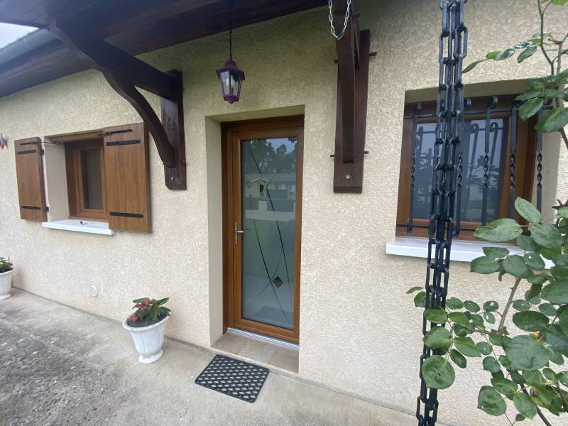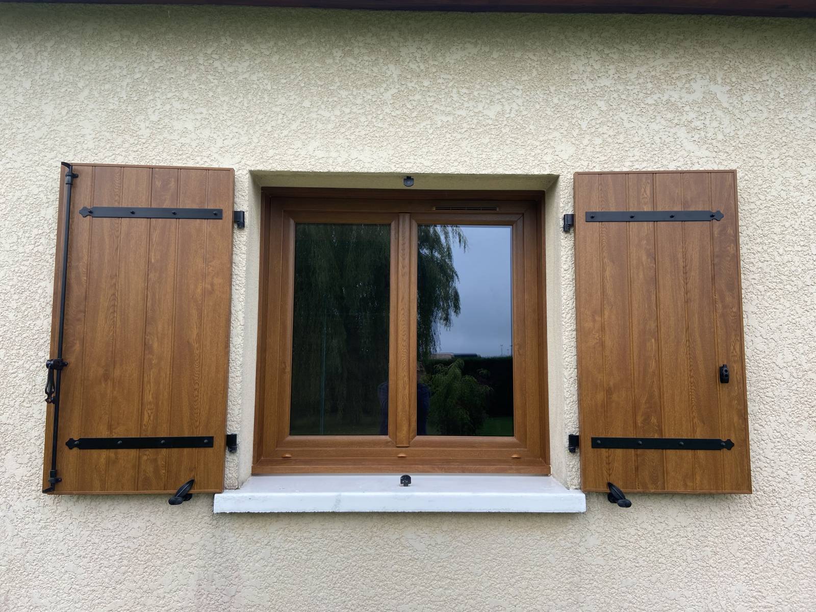 Remplacement de volets battants bois par des volets PVC plaxé Chêne Doré de 28 mm d’épaisseur avec pentures et contre pentures en aluminium noir.