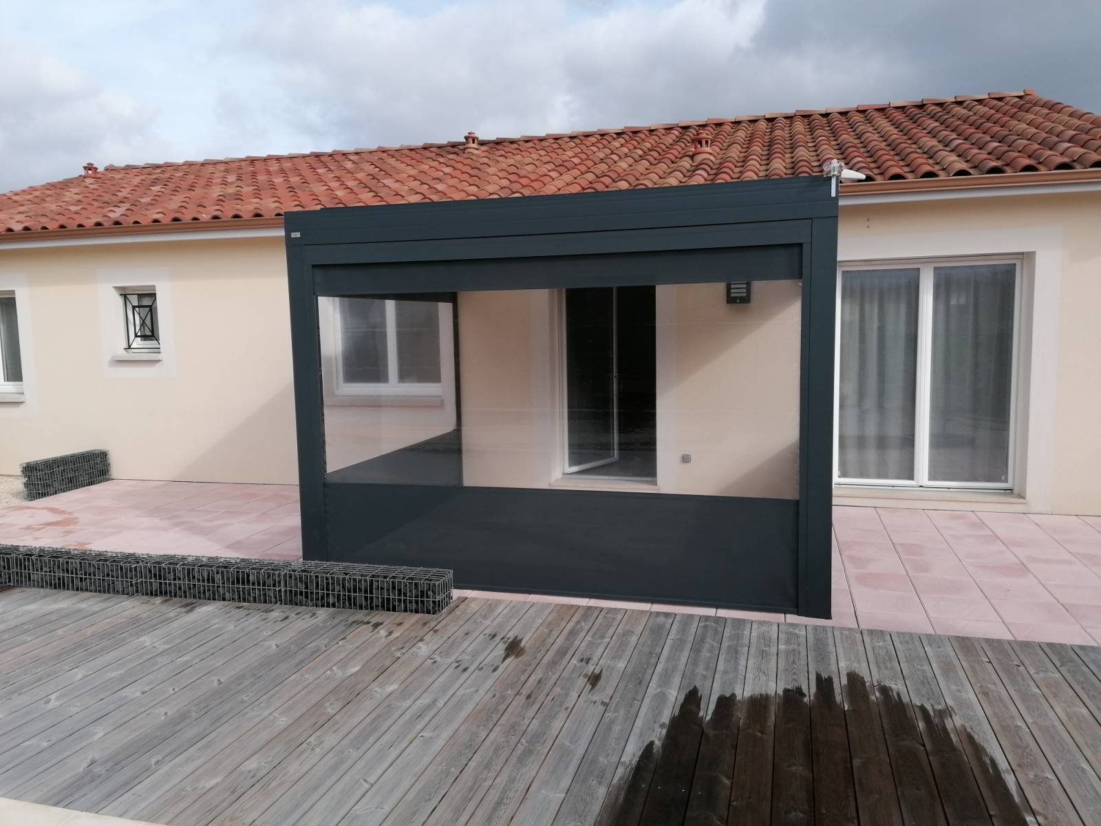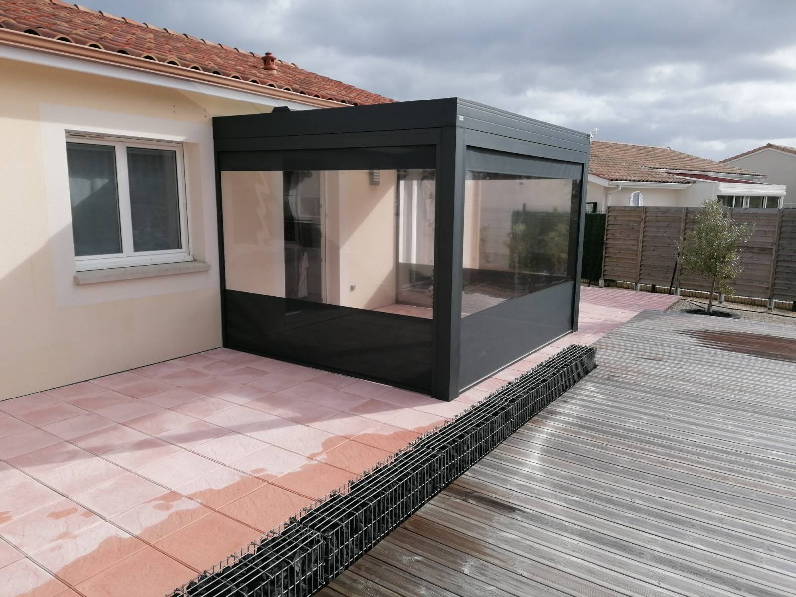 Les 3 côtés de la pergola sont munis de store ZIP dans des coulisses spéciales pour une meilleure tenue avec paroi cristal afin d’être à l’abri du vent et du froid.