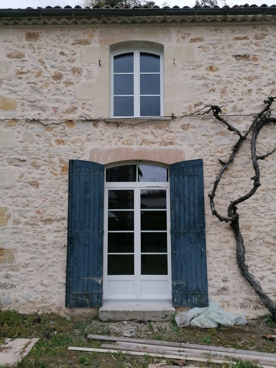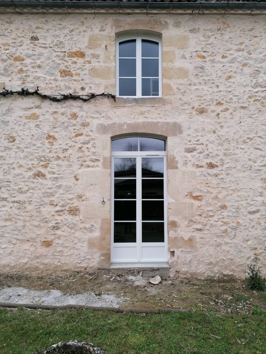 L’ensemble du chantier est en PVC Blanc en arc surbaissé (Pack Design) sans plomb en dormant de 72 mm, un double vitrage peu émissif argon 4.20.4 avec les petits bois en alu 26×8.