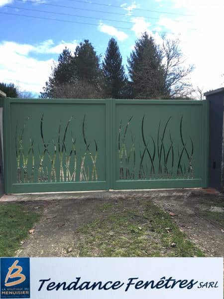 Portail 2 vantaux en aluminium thermolaqué avec découpe spéciale (ex : motif herbe) dans de la tôle de 4mm d’épaisseur.