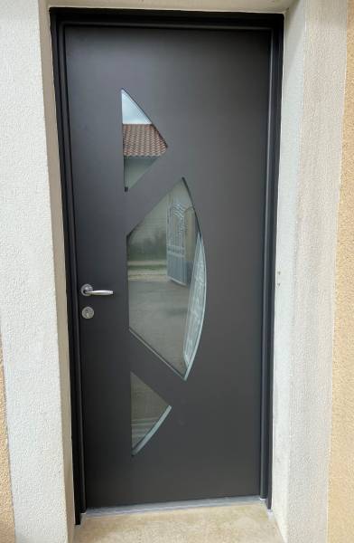C’est une porte d’entrée monobloc en aluminium de teinte Noire 2100 Sablé, de la collection LES CONTEMPORAINS modèle GOYA 3 Premium.