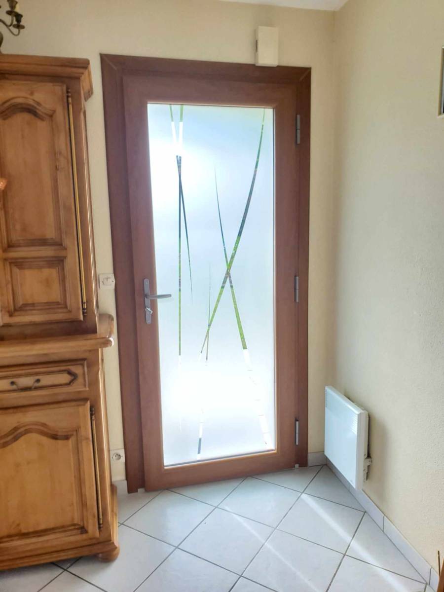Nous avons donc remplacé l’ancienne porte par une en PVC avec un vitrage décor sablé, 1 vantail de la gamme Castes Industrie PS007 – Fabrication française – Sablage classique avec :