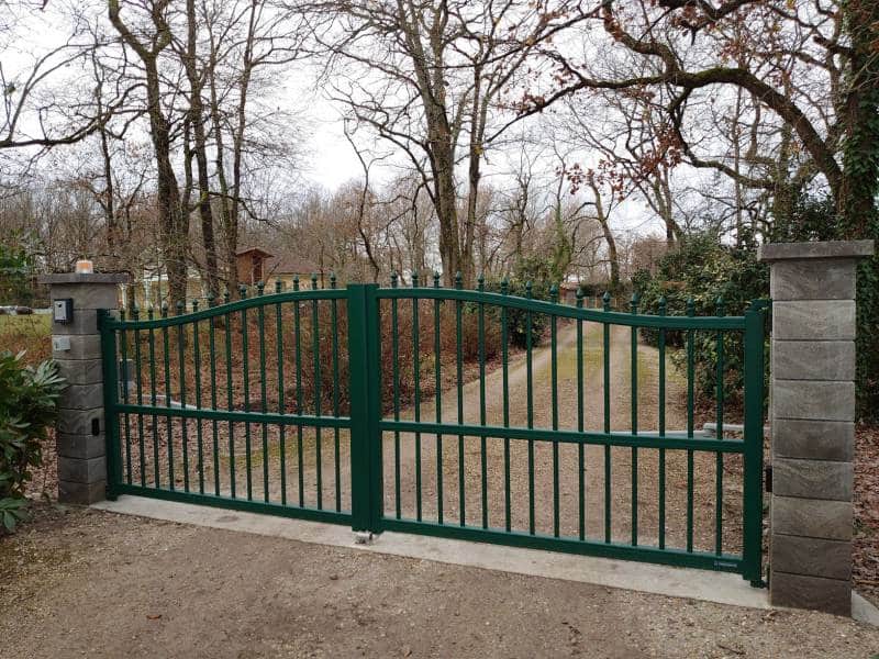 Ce portail est en aluminium 2 vantaux égaux en forme de chapeau de gendarme avec traverse intermédiaire renforcée et pointes motif goutte d’eau.