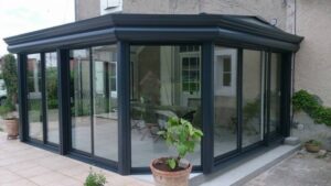 Le toit est fait de plaques polycarbonates épaisseur 3mm, traité anti UV, transparent massif noir fumé avec gouttières intégrées et invisibles pour l’évacuation des eaux