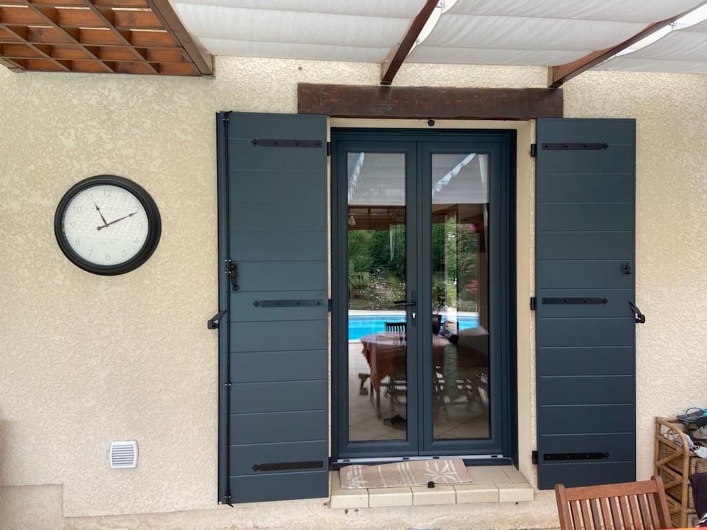 Ces volets 2 vantaux sont en aluminium de couleur gris Anthracite RAL 7016 aspect lisse avec espagnolettes, ferrages, pentures et contre pentures en aluminium noir.